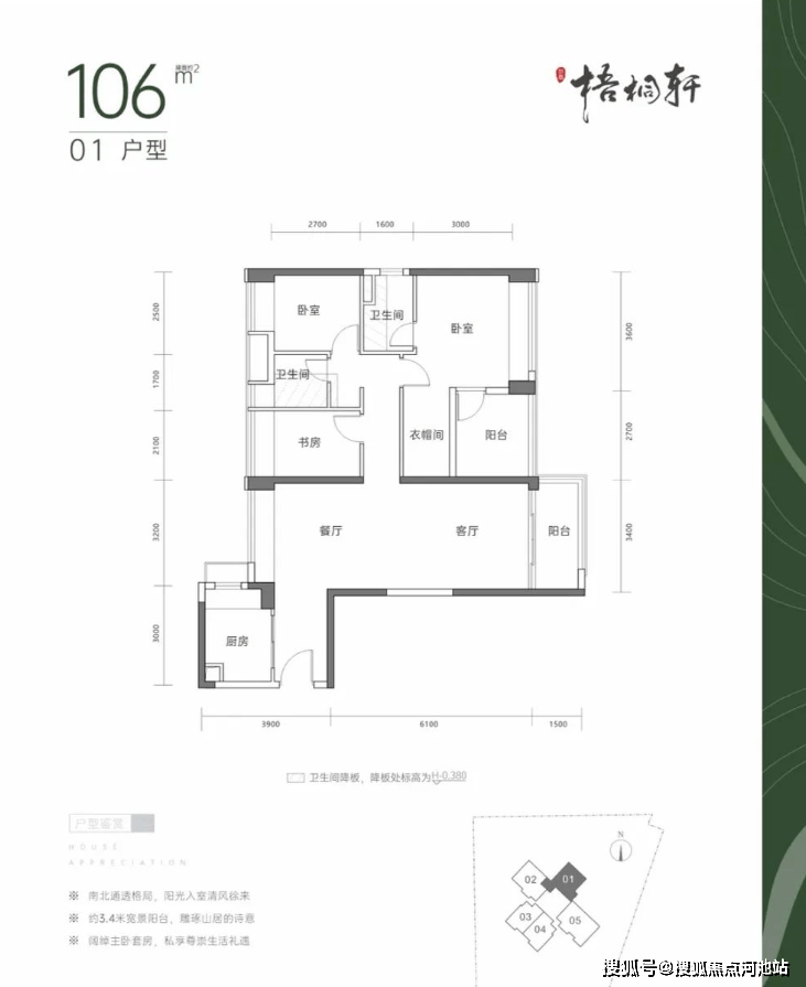 106㎡的4房2厅2卫,设计的竖厅南北通透格局,客厅3.4米开间,客厅阳台主朝东南朝向。