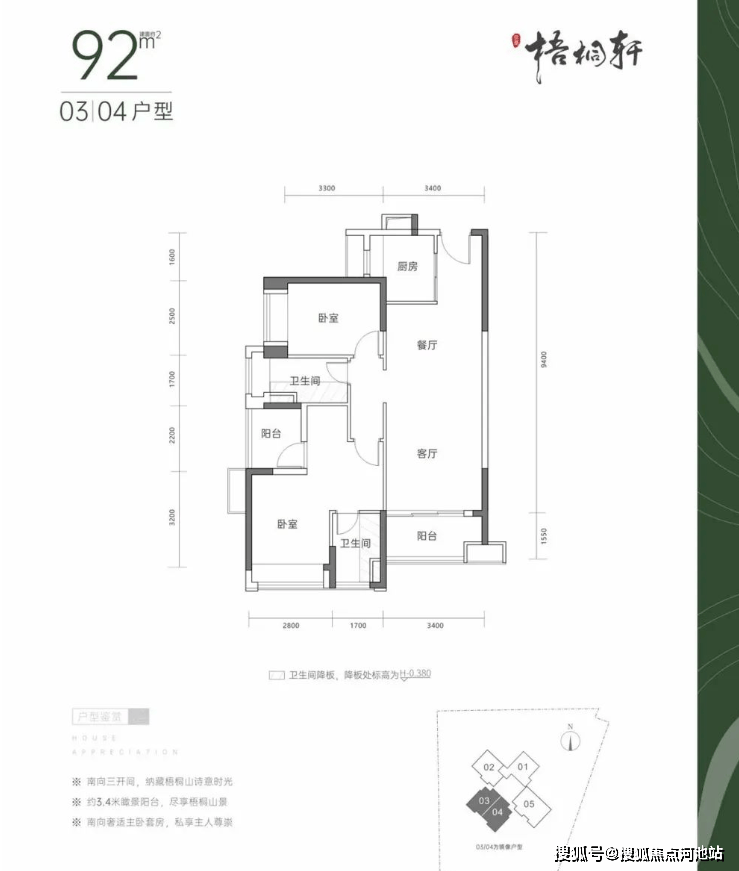92㎡的3房2厅2卫,设计的竖厅格局,客厅3.4米开间,西南朝向。
