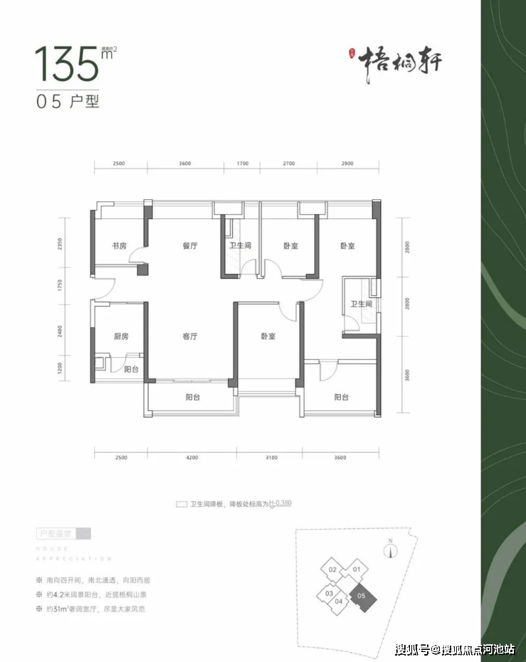 135㎡的5房2厅2卫,设计的竖厅南北通透格局,客厅4.2米开间,客厅阳台主朝西南朝向。