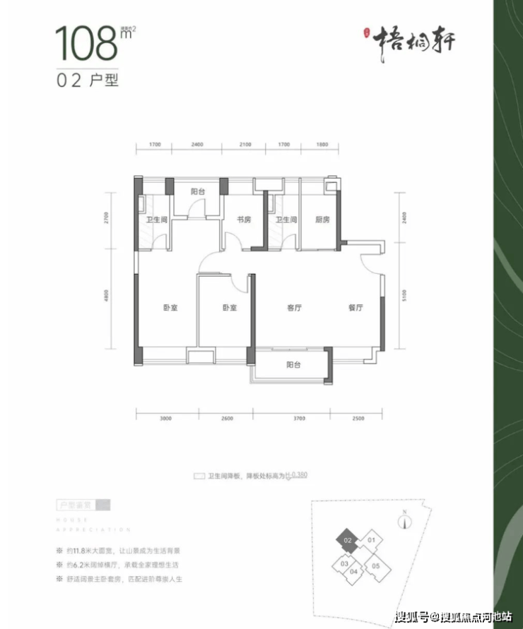 108㎡的4房2厅2卫,设计的横厅南北通透格局,客餐厅6.2米宽。