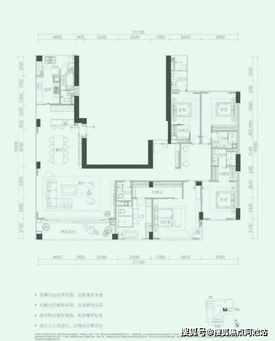 户型四套间设计,配备工人房,主佣分区,竖厅布局,约12m双厅进深,空间利用率很高。东端头位置,所有卧室都有开阔的景观,270°景观完全无遮挡。只存在T1B栋33-38层,仅6套。