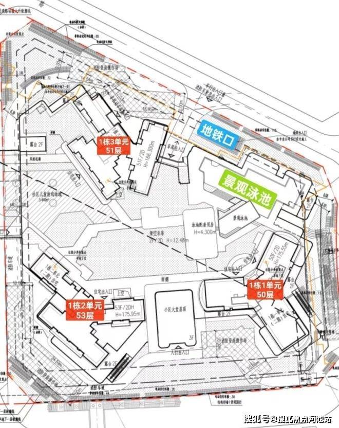二期地块为3栋纯商品房,总高50-53层。其中:1栋1单元为一层3户的设计,1栋2单元为一层4户,1栋3单元为一层5户,主打大面积改善产品,主要以东南和西南朝向为主,景观泳池也规划在该地块。