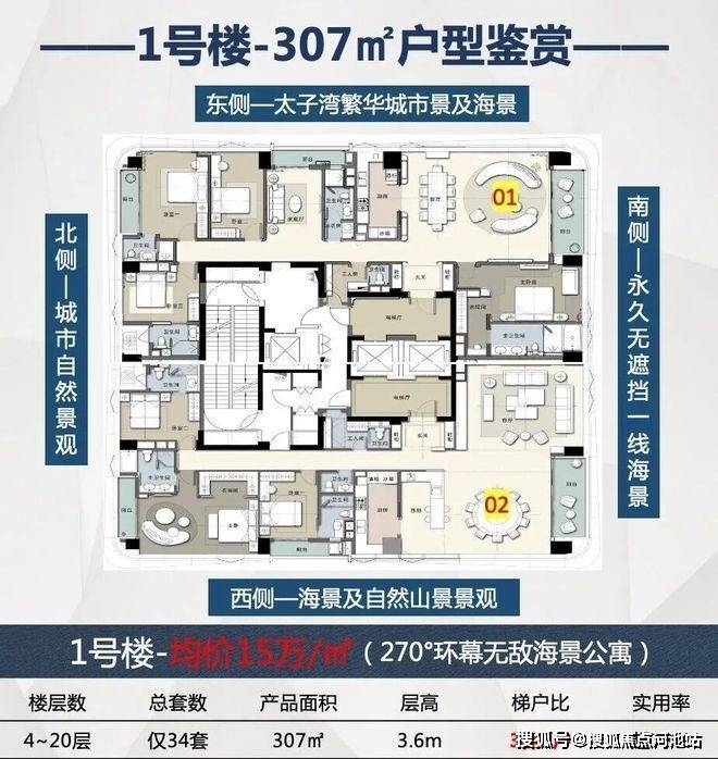 2、建面约307㎡ 4+1房3厅5卫(01户型),6.3-8万/㎡,总价1943-2600万