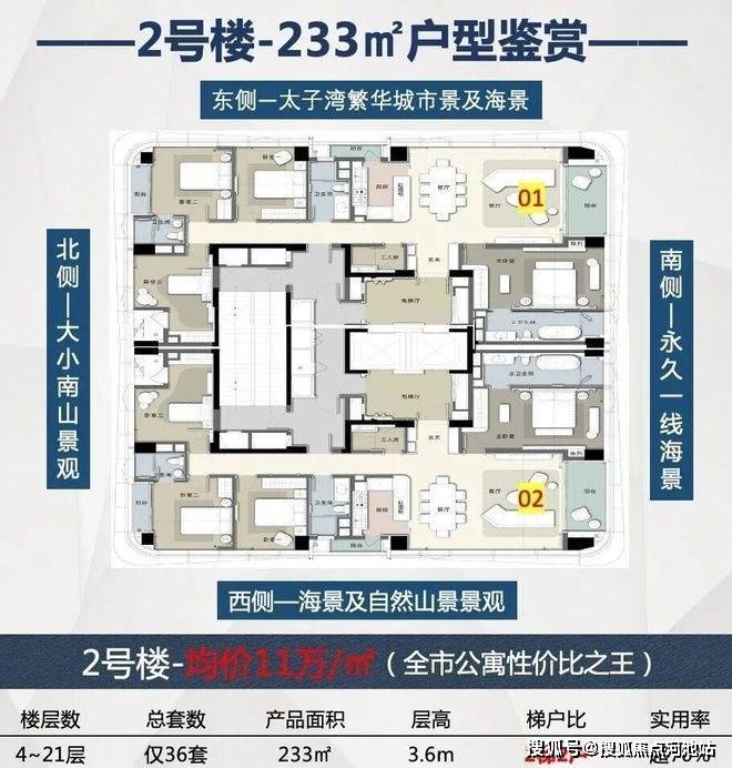 项目是太子湾板块唯一在售的真公寓,一线无遮挡南向海景,永久臻藏。全部户型都通燃气,户户三阳台,270°IMAX环幕视野,南北通透,部分户型阳台面宽逾16米。层高3.6米,是公寓产品里的黄金层高,空间感非常阔绰。车位配比1:1.5,一户双车位,湾区顶豪标准。