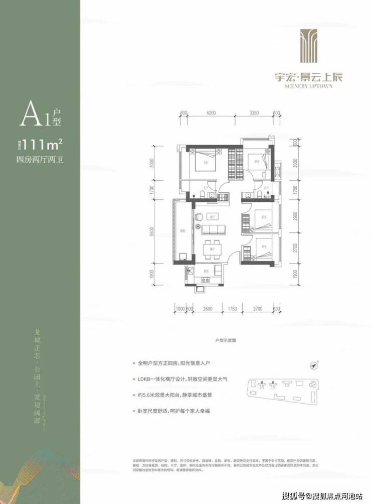 111㎡四房两卫,是典型的横厅南北通产品,五开间朝南,客餐厅约5.6米开间,连通5.6米阳台,公卫三段式分离,L 型厨房,卧室宽度基本在2.7–3 米之间。