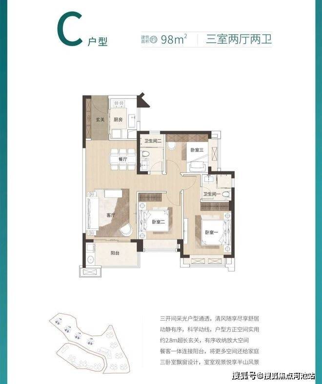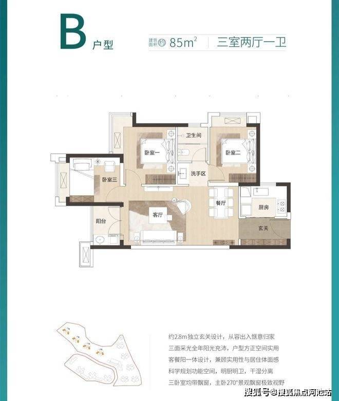 85㎡三房两厅大三房,2.8m超长玄关,270度景观飘窗,明厨明卫