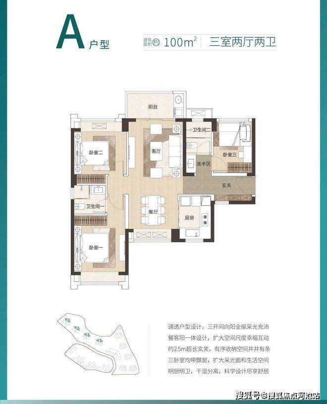 100㎡通透性三房两厅2卫大三房,2.5m超长玄关,南北通透,景观大阳台