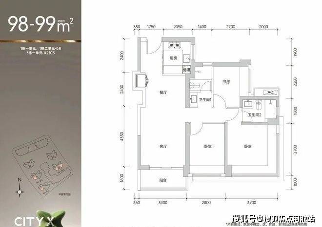 约98㎡(3房2卫)约208套 折后377-418万