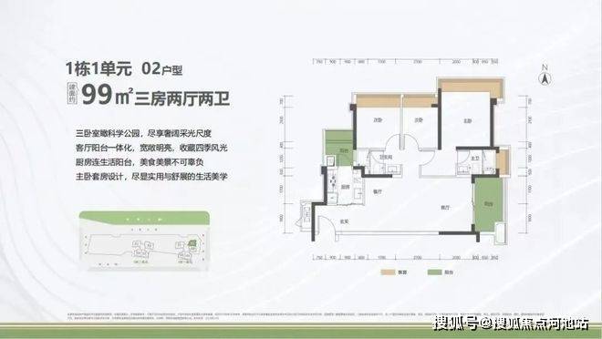 竖厅格局,客厅3.5米开间,LDKB一体化设计,进深11.31米,动静分区,三卧室朝东北向看科学公园,二字型厨房还带1个生活阳台,公卫三段式分离,阳台1.5米进深,东南朝向,加上赠送后得房率约92.7%。