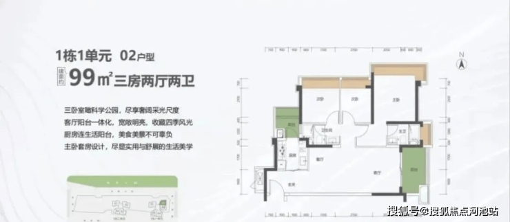 99㎡的3房2厅2卫,1栋1单元02户型,设计的是竖厅格局,客厅3.5米开间,LDKB一体化设计,进深11.7米,动静分区,三卧室朝东北向看科学公园,3个卧室分别做到了主卧18.06㎡/次卧9.57㎡/次卧7.59㎡(包含飘窗),二字型厨房还带1个生活阳台,公卫三段式分离,得房率约:80%(不含赠送),阳台6.55㎡东南朝向。套内面积79.2㎡+赠送面积12.58㎡=实用面积91.78㎡,加上赠送后得房率约92.7%。