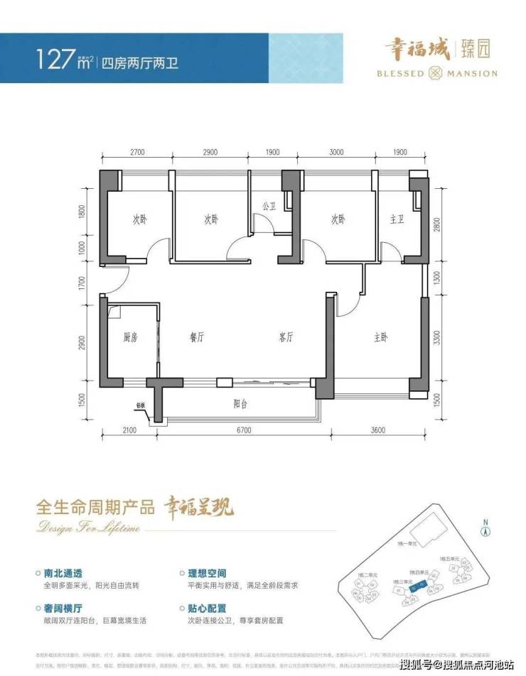 127㎡4房2卫,客餐厅6.7米开间,得房率约87.72%(包含赠送),阳台主朝东南向。