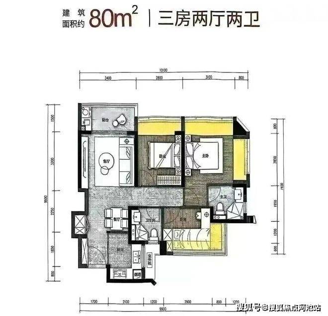 80㎡的3房2厅2卫(新增户型),设计的是竖厅格局,客厅3.4米开间,LDKB一体化,S墙设计预留冰箱卡槽位,动静分区,U型厨房,卫生间干湿分离,得房率约79.6%(不含赠送),阳台4东北朝向。