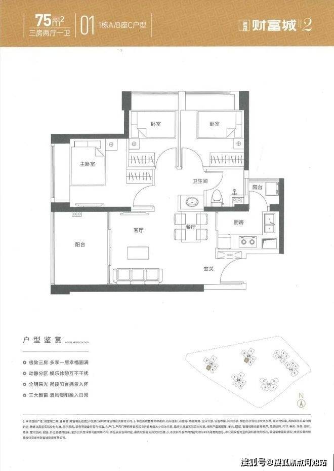 2,财富城二期分为三个地块,共十三栋,首开的弘德苑有六栋,属于中大型的小区,车位比超过一比一,七十五平方可以做三房,一百零五平方可以做四房两卫不显拥挤,阳台有二点五米进深,户户都是双阳台设计