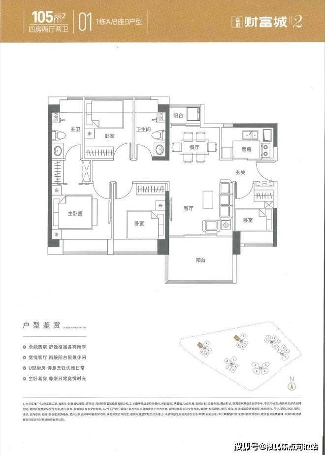 105㎡的4房2厅2卫,折后总价345-372万/套,单价3.28-3.54万/㎡。