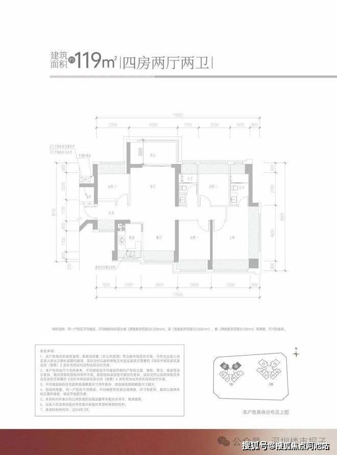 119㎡的4房2厅2卫,设计的竖厅南北通透格局,客厅4米开间,进门独立玄关,4个卧室分别做到了4米/2.8米/2.7米/2.6米的宽度,U型厨房,公卫三段式分离设计,得房率约:95%(包含赠送),阳台主朝西北或东北向,看科学公园景观。