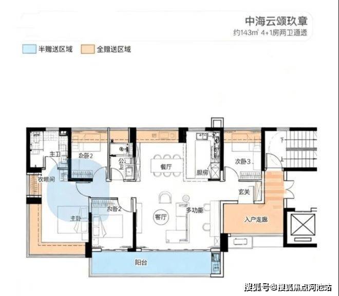 143㎡的4房2厅2卫,设计的是横厅南北通透格局,进门独立入户走廊全赠送,客餐厅分离化设计,横厅大客厅+功能间,五开间朝南,主卧270°无柱转角飘窗+1个次卧朝南,2个次卧朝北向,U型厨房,卫生间干湿分离,得房率约:100%(包含赠送),西南或正南朝向。