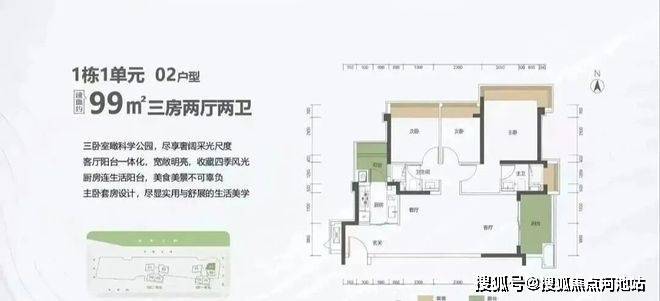 99㎡的3房2厅2卫,1栋1单元02户型,设计的是竖厅格局,客厅3.5米开间,LDKB一体化设计,进深11.31米,动静分区,三卧室朝东北向看科学公园,二字型厨房还带1个生活阳台,公卫三段式分离,阳台1.5米进深,东南朝向。