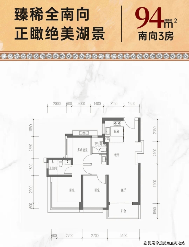 94㎡的3房2厅2卫,设计的是经典竖厅格局,客厅3.4米开间,LDKB一体化,S墙设计预留冰箱卡槽位,动静分区,三开间朝南,分别做到了主卧13.55㎡/次卧9.45㎡/次卧7.28㎡(包含墙体飘窗),U型厨房,公卫三段式干湿分离,得房率约74%(不含赠送),阳台东南朝向约5.27平。套内面积69.94㎡+赠送面积9.65㎡=实得面积79.59㎡,加上赠送后得房率约84.22%。