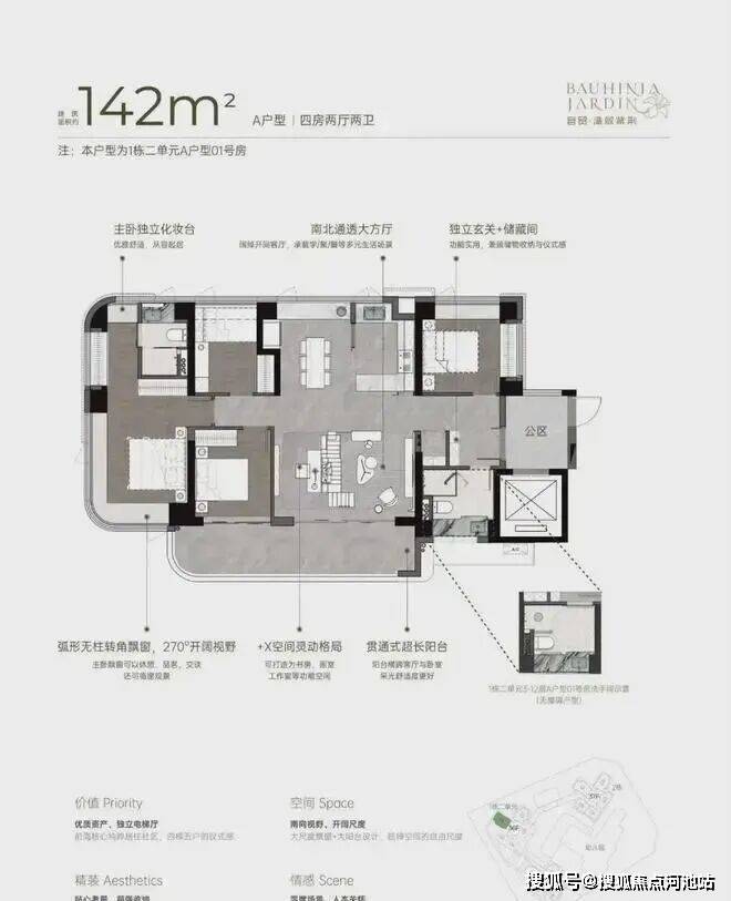 户型创新:全盘采用4梯5户独立电梯厅设计,部分户型配备270°弧形飘窗,主卧套间+双龙抱珠格局提升私密性。