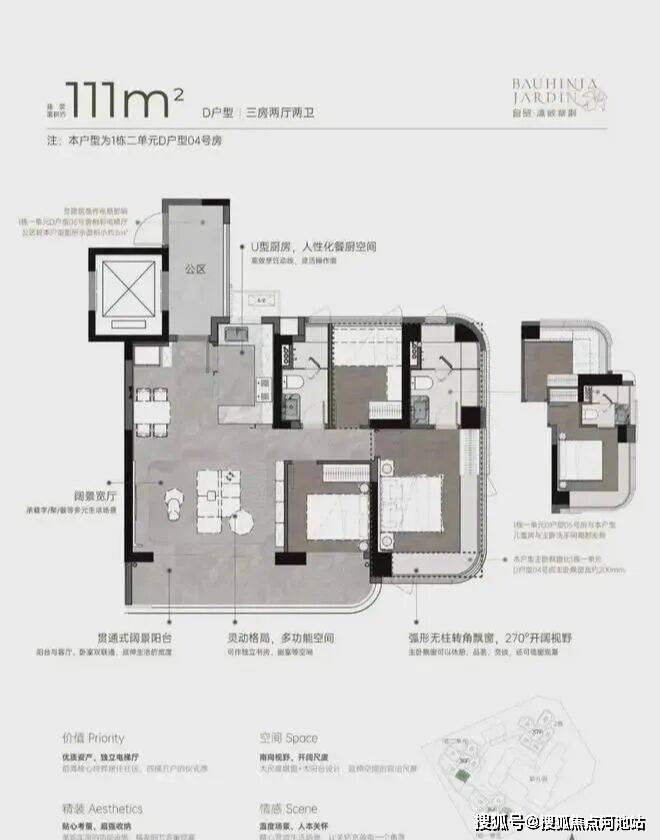 96m²三房两厅两卫的E户型:从空间布局来看,U 型厨房的设计极为人性化,大开间客厅与宽阳台是整个户型的最大亮点,西南向视野使得整个户型采光充足,贯通式阔景阳台与客厅、卧室双通,极大地拓展了生活空间的宽度。主卧的飘窗台也是一大亮点,弧形无柱转角飘窗不仅提供了广阔的视野,还增加了室内的采光。