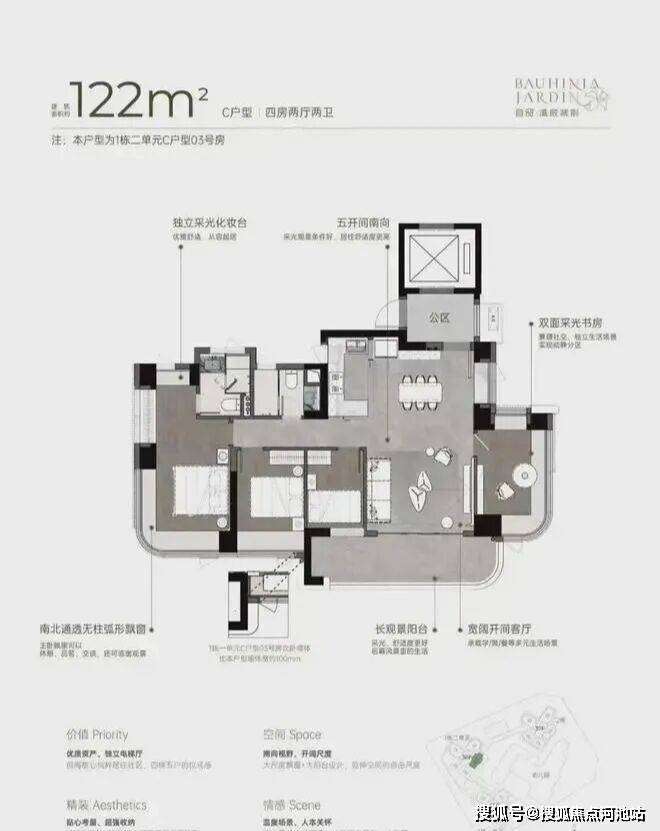 122m²四房两厅两卫的C户型:双龙抱珠户型,书房分布于客厅另一侧,且难得是双面采光+270°景观视野。主卧南北通透,且拥有十分开阔的景观面。贯通式阳台联通客厅以及靠近动区的次卧,实现长观景阳台。