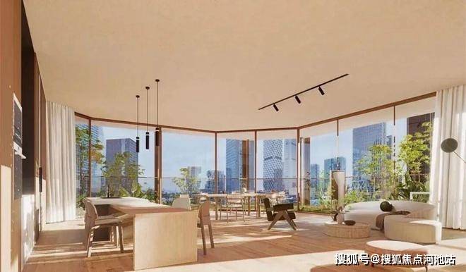 建筑外立面线条简洁硬朗,采用全玻璃幕墙设计。户型内部拥有超大阳台,配以绿植,强调自然与居住融合,打造立体绿洲。
