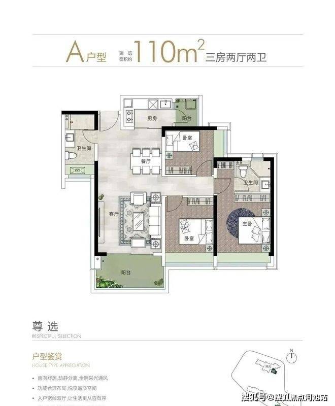 110㎡的3房2厅2卫,A户型,设计的是竖厅格局,客厅3.9米开间,LDKB一体化设计,三开间朝南,3个卧室分别做到了主卧15.95㎡/次卧12.6㎡/次卧9.18㎡(包含墙体飘窗),L型厨房还带1个小生活阳台,卫生间干湿分离,得房率约79.24%(不含赠送),阳台进深2.05米,西南向。