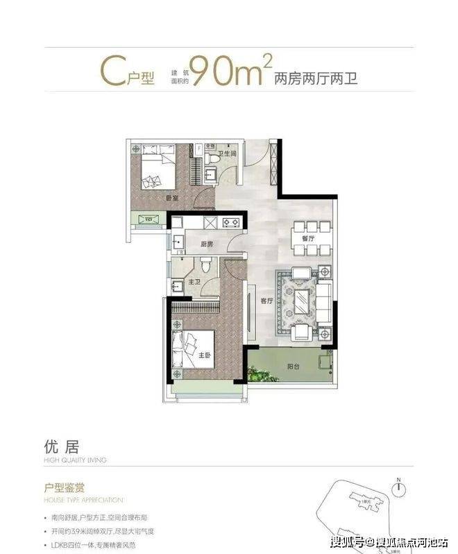 90㎡的2房2厅2卫,设计的是竖厅格局,进门入户玄关,客厅3.9米开间,LDKB一体化设计,2个卧室分别做到了主卧13.86㎡/次卧10.23㎡(包含墙体飘窗),L型厨房,卫生间干湿分离,得房率约79.24%(不含赠送),西南朝向。
