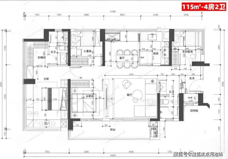 115㎡的4房2厅2卫,设计的是竖厅南北通透格局,进门入户玄关,客厅4.45米开间,餐客厅分离设计,客厅连接次卧出10.87m²的观景大阳台,L型中式+岛台灵动式厨房,公卫三段式干湿分离,得房率约78.27%(不含赠送),阳台主朝东南或西南向。靓点:南北对流+7.25米长超大观景南向阳台,超大主卧+270°无柱转角飘窗