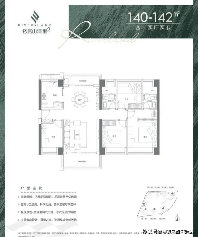 140-142㎡4房2厅2卫:设计的是竖厅格局,客厅4.3米开间,南北通透双阳台,四开间朝南,全屋飘窗,U型厨房,阳台1.5米进深,主朝东南向。