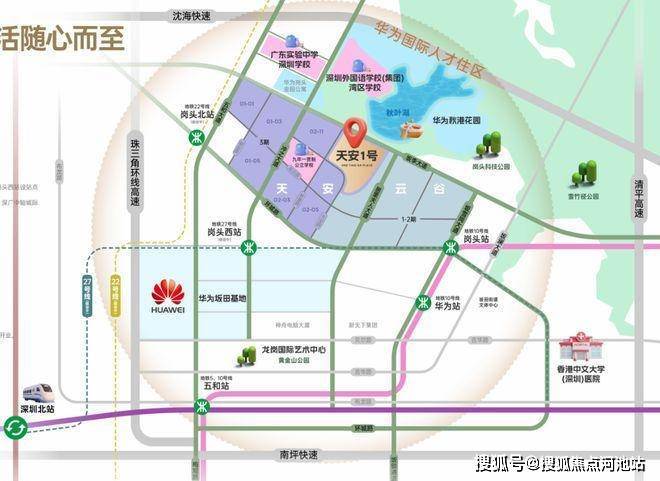 作为龙岗坂田北最大体量旧改项目,天安云谷位于坂田街道冲之大道和坂李大道的交汇处,毗邻地铁22号线岗头北站(建设中)。项目占地面积约13.14万㎡,由8个地块组成,建面约128万㎡,集产业、办公、居住、商业等于一体。其中,三期是天安云谷首个包含住宅的项目,建成后将有21栋住宅+2栋酒店+2栋公寓办公,预计提供住宅5886套,保障房640套。