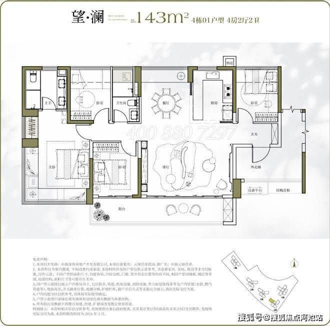 143㎡的4房2厅2卫:设计的是横厅南北通透格局,进门独立入户走廊全赠送,客餐厅分离化设计,横厅大客厅+功能间,五开间朝南,主卧270°无柱转角飘窗+1个次卧朝南,2个次卧朝北向,U型厨房,卫生间干湿分离,得房率约:100%(包含赠送),西南或正南朝向。