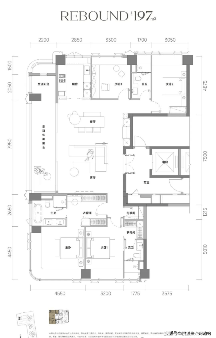 建面约197㎡户型,含电梯厅综合赠送后使用率可达93-95%。