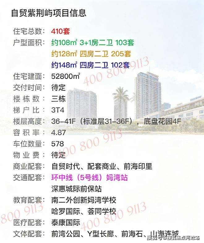 以上就是关于深圳前海妈湾【自贸紫荆屿】楼盘相关的详细介绍,看完以上内容,如果您对我们楼盘还有任何疑问,欢迎联系自贸紫荆屿楼盘开发商售楼处电话:400-800-9113(中介或自媒体请勿扰)进行免费咨询或预约看房,可以安排本楼盘现场销售在线为您一对一服务,现场销售人员会把楼盘的新资料、样板间图片视频、都发微信给您看、您不需要过来楼盘现场都能够熟悉个大概,还可以了解到本楼盘的优点缺点、房产政策、银行贷款政策、积分入学、都给您讲解的明明白白。