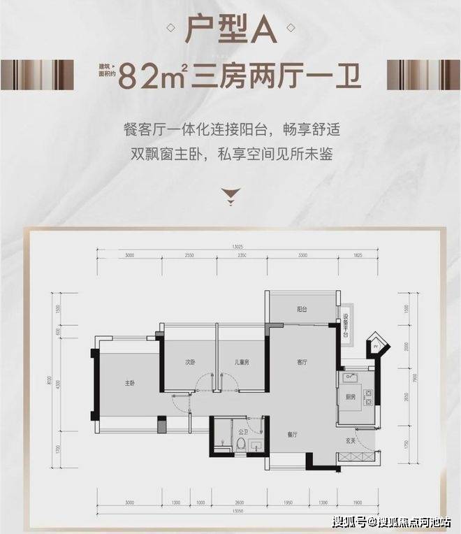 竖厅南北通透格局,进门入户玄关,客厅3.3米开间,主卧双飘窗南北通设计,U型厨房,得房率:77.51%(不含赠送),阳台主朝东北向。