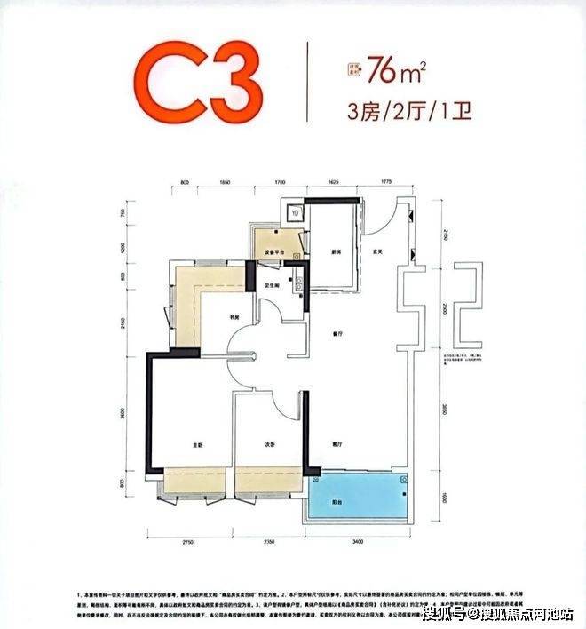 76㎡的3房2厅1卫: