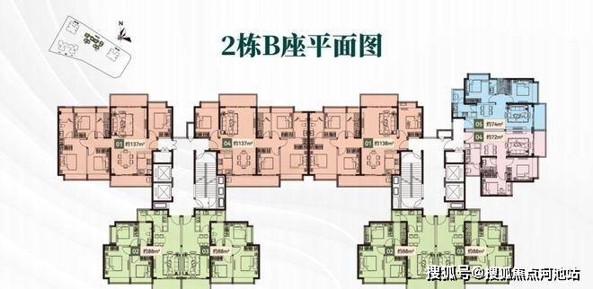 项目总占地约2.1万㎡,由4栋塔楼和1个幼儿园组成,采用围合式布局。目前推售的是位于社区正中央的2栋B座,共235套房源。