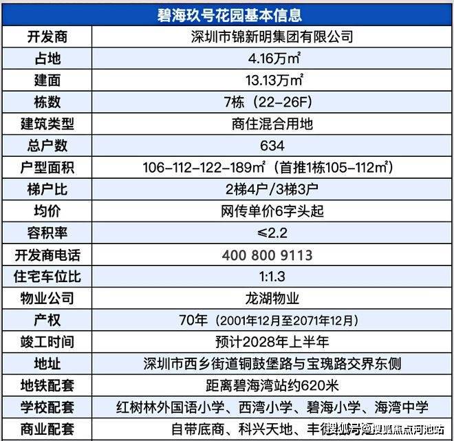 最新消息:碧海玖号花园最新官方户型图出炉:2026年4月10正式开放样板房,计划4月底开盘入市,本项目层高在23-26F之间,容积率仅2.2,住宅户型为建面约105-189㎡新规高得房率的山海4房(首推1栋/3栋共196套约106-112-123㎡精装四房),2梯4户及3梯3户的梯户比。温馨提示:因近期本项目参观样板房的购房太多,采取预约制,过来现场参观需提前拨打开发商电话:400 800 9113 进行在线预约,并且到现场需要验资,欢迎提前预约参观!