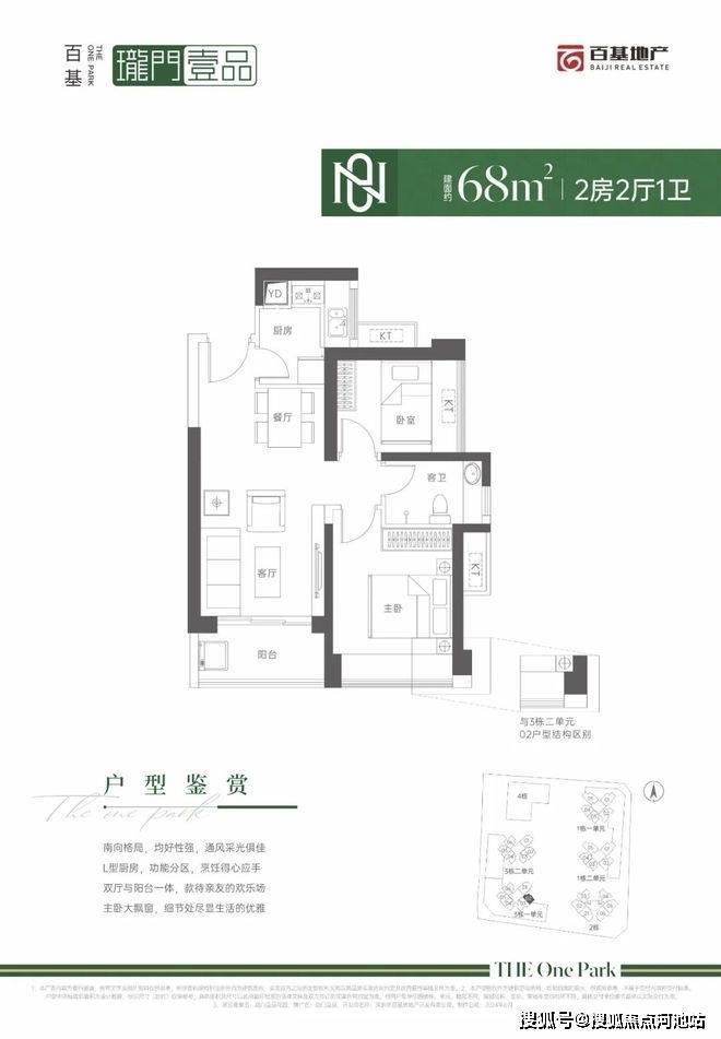 68㎡的2房2厅1卫,仅3栋1单元02户型,设计的是竖厅格局,客厅3.2米开间,LDKB一体化设计,L型厨房,卫生间干湿分离,得房率:71.3%(不含赠送),东南朝向。