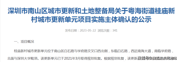 2023年5月时候,南山区城市更新和土地整备局发布关于粤海街道桂庙新村城市更新单元项目实施主体确认的公示。