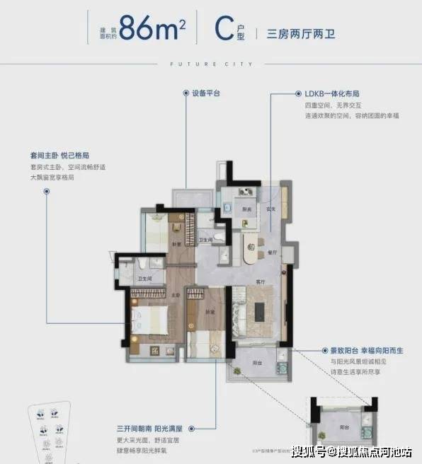 项目一期地块名为蔚蓝海尚花园,共分A、B、C三个区域,合计提供2380套住宅。户型面积涵盖63-113平方米的两房至四房,满足不同家庭结构的需求。