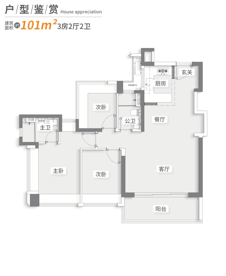 建面约101㎡ 三房两厅两卫 灵动岛境