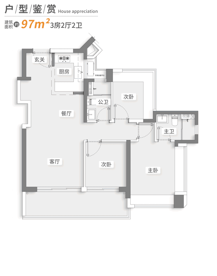 ③97㎡非独立入户户型,传统竖厅+动静分区结构,此互相与02基本是一致的,主要的区别在于朝向。