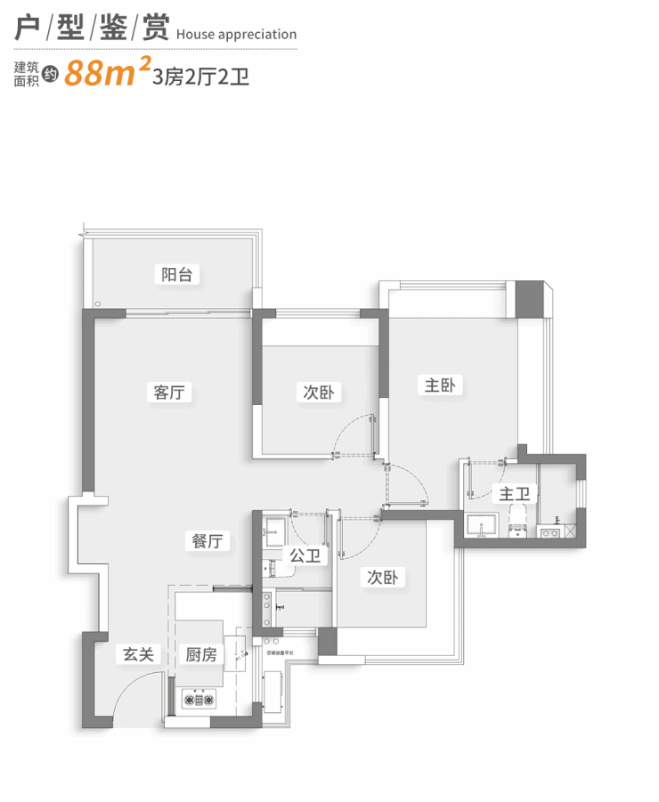 建面约88㎡ 三房两厅两卫 玲珑心屿