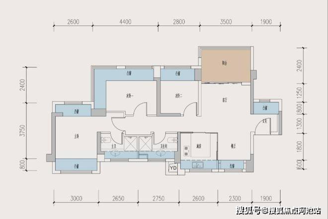 润臻园建面约89平D3+1户型 南北通透设计,空气流通强,客餐厅空间灵活,餐厅位置可改成一个房间使用,270°采光面,9个飘窗设计把得房率提高到100%,主卧南北通,西南向。