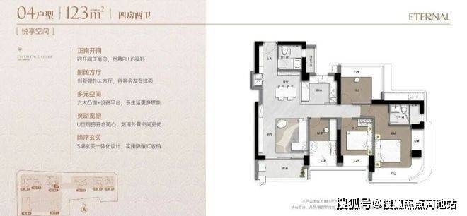 123㎡四房两卫(约1183-1346万):双龙抱珠,南北通透,每个房间面积都还可以,主卧出阳台可以改成一个房间或书房。阳台比较大,但过道狭长,有些浪费。每个功能间都有飘窗,主卧飘窗为弧形转角设计,颜值在线,房间的采光和通透感更好