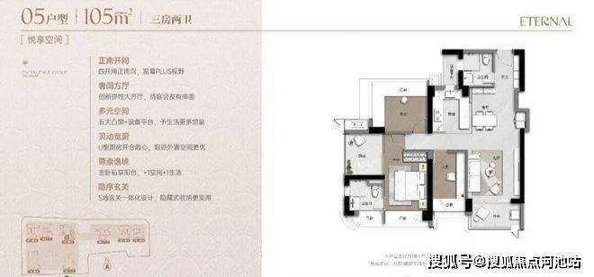 105㎡3+1房两卫(约1003-1144万):竖厅格局,次卫设在进门处,去洗手间需要绕过厨房和餐厅,有两个次卧都要睡飘窗。主卧出阳台可以改房间,但面积较小,更适合做书房或储物间。这个户型实现了四开间朝南+3+1房灵动布局,客厅与阳台相连,采光通风俱佳,满足三代同堂或二孩家庭的改善需求。