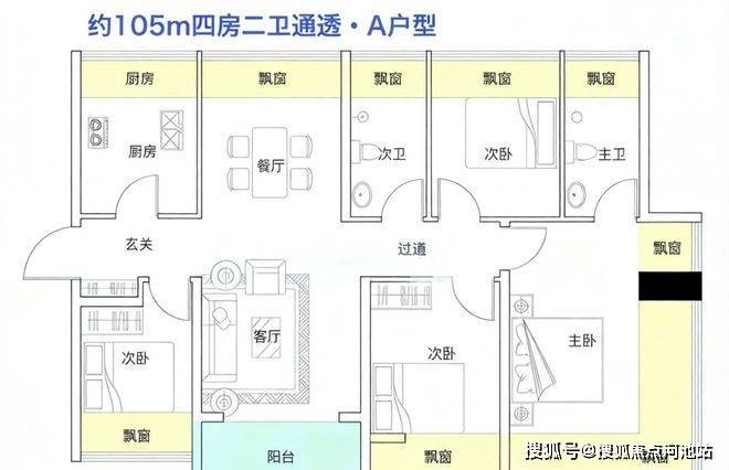 105㎡的4房2厅2卫,设计的是竖厅南北通透格局,餐客厅分离设计,四开间朝南,全屋十面飘窗,主卧270°无柱转角飘窗,U型厨房,卫生间干湿分离,得房率约100%(包含赠送),阳台东南朝向。