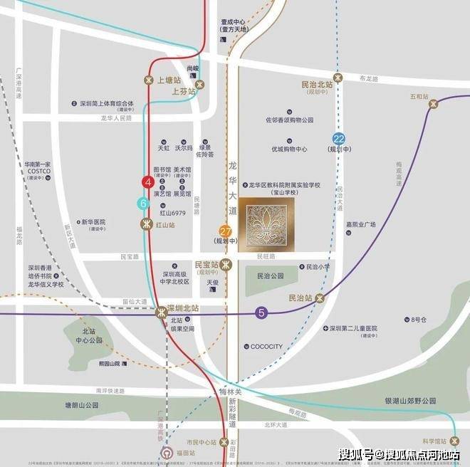 地铁:4、6号线,红山站约1.3公里。1站直达深圳北站。4站到福田。5号线,民治站约1.4公里。22号线(规划中)四轨交汇环绕。