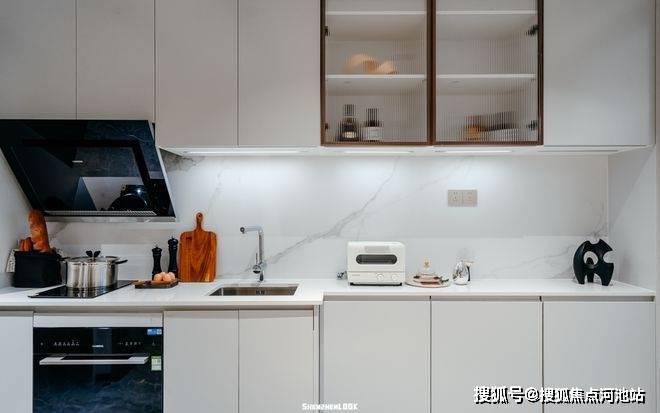 从玄关进门,一侧是隐藏式鞋帽柜,入门即收纳。一字型开放厨房,把过道纳入餐厨区,避免了逼仄感,油烟机、燃气灶一应俱全。另一侧为干湿分离的卫浴,合理地规划了每一寸空间。